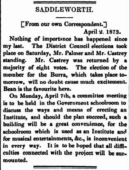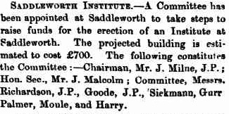 The objective of the Saddleworth institute is to promote useful knowledge and rational mental and physical recreation. By the means of the arranging and promoting of lectures, concerts, social evenings, picture shows, classes, and other like activites.
